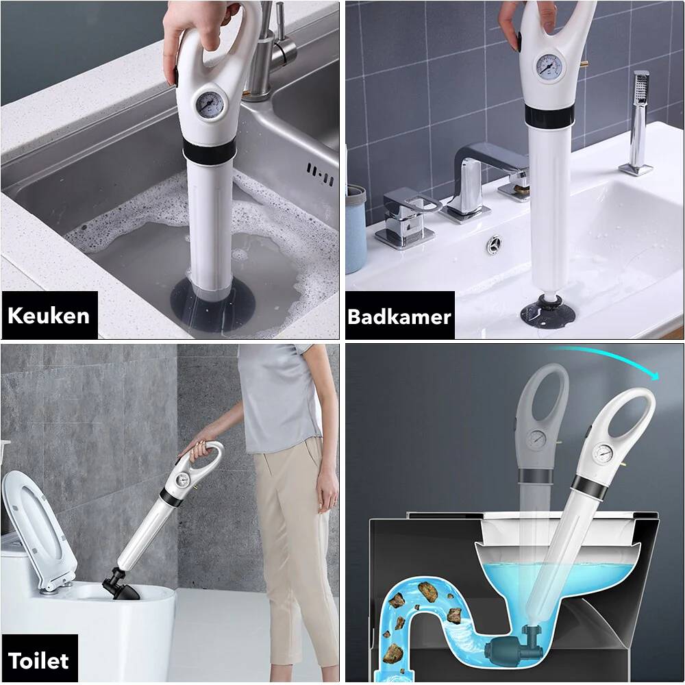 Het ontstoppen is kinderlijk eenvoudig met AllesOntstopper™. Je pompt lucht tot de gewenste druk met de meegeleverde pomp. Plaats hem op de verstopte afvoer met het juiste mondstuk en druk op de knop: het resultaat is een perfect doorlopende waterafvoer van jouw toilet, gootsteen, douche of bad.