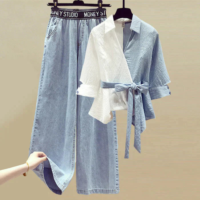 Deze luxe set zal je charme brengen. De set is gemaakt van hoogwaardig materiaal en bestaat uit een blouse en een bijpassend broekje. Geniet de hele dag van het comfort van de denimmix zonder afbreuk te doen aan de stijl. De top en het broekje met wijde pijpen creëren een tijdloze en elegante look.