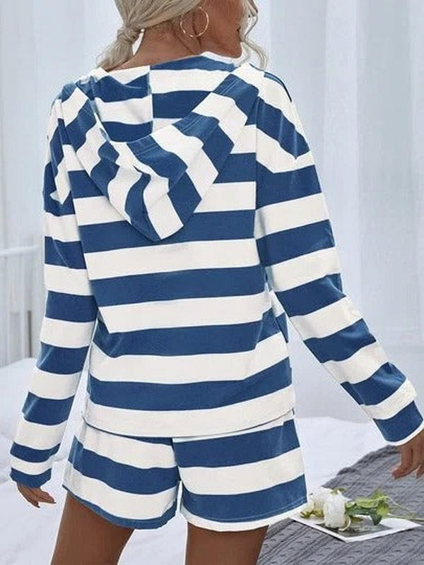 Wij zijn geobsedeerd door deze outfit. Schattige gestreepte top en hoodie met schattige bijpassende shorts. De charmante stijl zorgt ervoor dat u zich thuis of in de stad kil voelt.