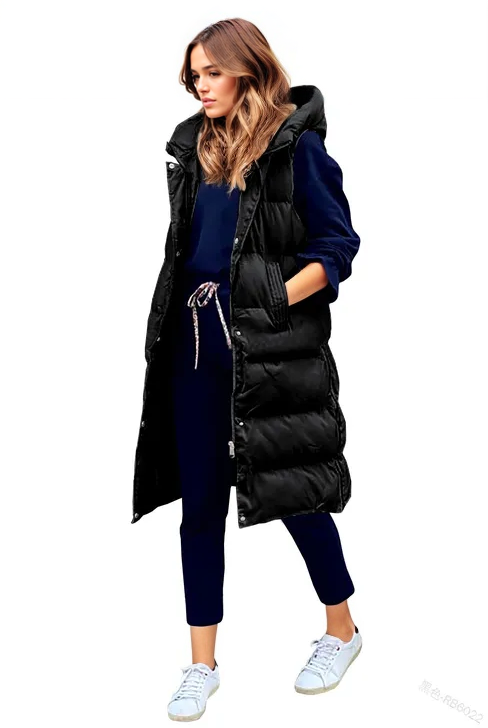 Lange mouwloze jas met capuchon en knoopsluiting