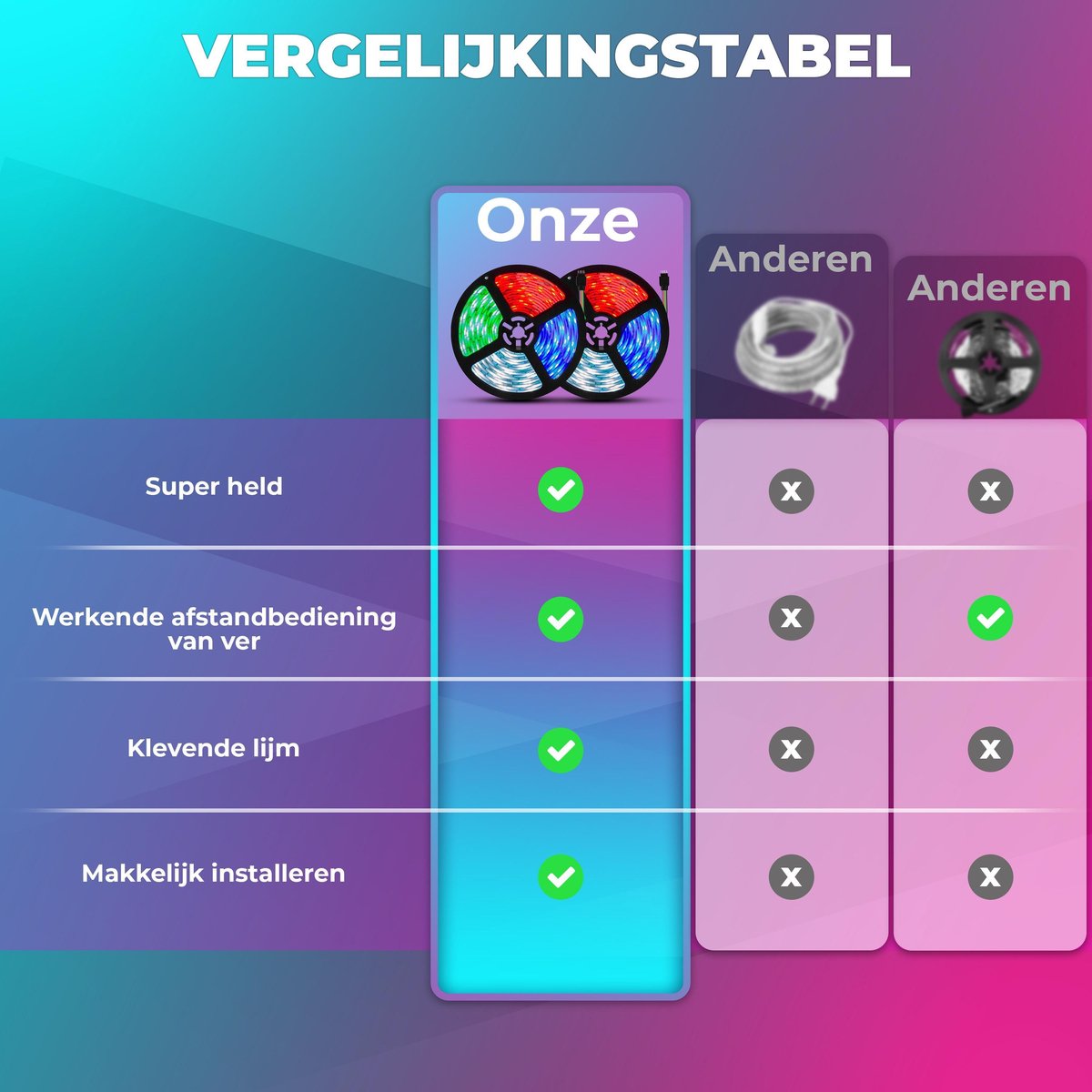 Deze LED-strip beschikt over vele kleuren en heeft de mogelijkheid om deze kleuren te combineren. Hierdoor is het mogelijk om prachtige combinaties te creëren en de gezelligheid te laten overheersen. Op de meegeleverde afstandsbediening heb je de opties om de kleuren te combineren, de led strips te laten veranderen van ritme/beat en verschillende snelheden te installeren.
