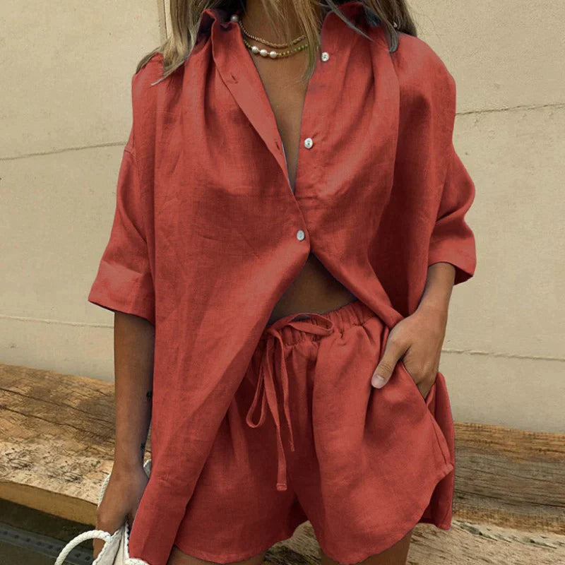 Moeiteloze elegantie: Met het elegante en moderne ontwerp van de Naomi katoenen set kun je je loungewear moeiteloos upgraden. Of je nu thuis ontspant of een avondje uit gaat, deze set is de perfecte combinatie van comfort en stijl. Wees voorbereid op complimentjes als je vol zelfvertrouwen pronkt met je modieuze keuze.