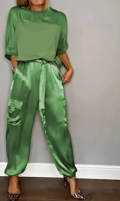 Stap de dag in met zelfvertrouwen in deze zijdezachte satijnen set. De gladde stof en het verfijnde ontwerp zorgen voor een chique uitstraling, perfect voor zowel casual als formele gelegenheden. Ervaar de ultieme combinatie van luxe en gemak terwijl je de dag doorbrengt in deze veelzijdige set.