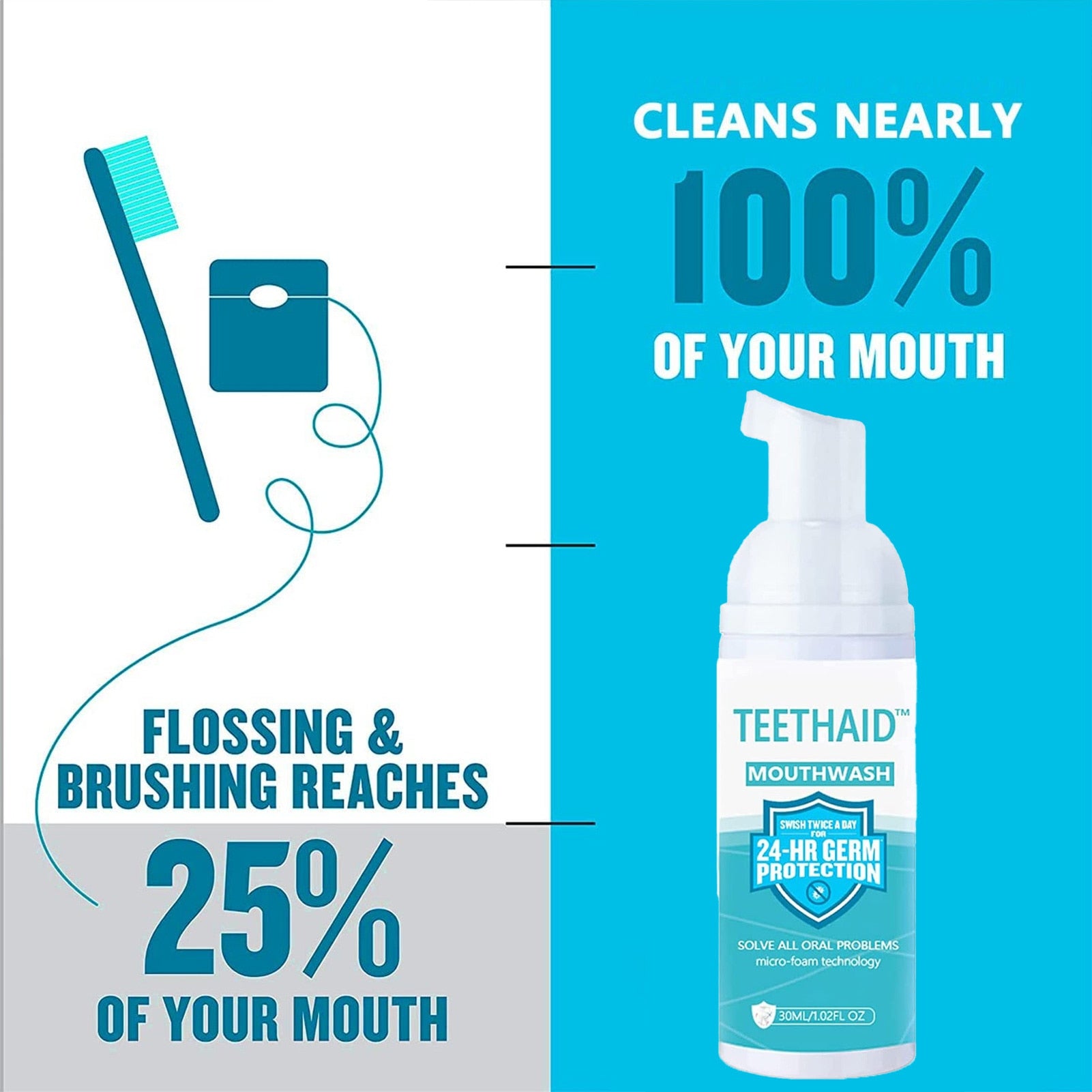 Gemakkelijk in gebruik: Het gebruik van TEETH AID™ Mondspoelmiddel is eenvoudig en past perfect in je dagelijkse mondverzorgingsroutine. Spoel gewoon je mond gedurende 30 seconden met een kleine hoeveelheid mondspoelmiddel na het tandenpoetsen en spuug het daarna uit. Het is zo simpel!