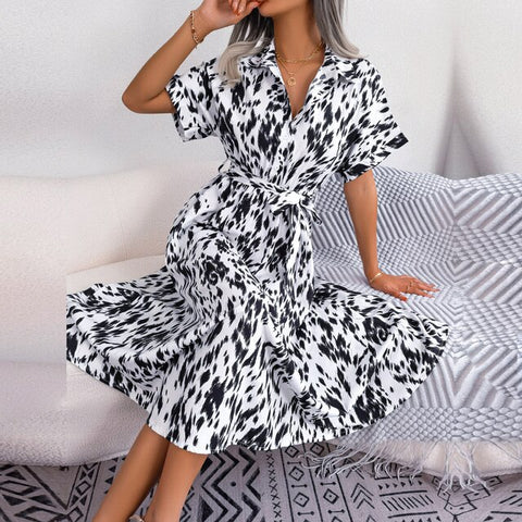 Deze opvallende overhemdjurk heeft een betoverende print en een tailleband die je figuur prachtig flatteert. Met zijn stijlvolle midilengte, korte mouwen en hals met kraagje zul je in het middelpunt van de belangstelling staan en zelfvertrouwen en elegantie uitstralen waar je ook gaat.